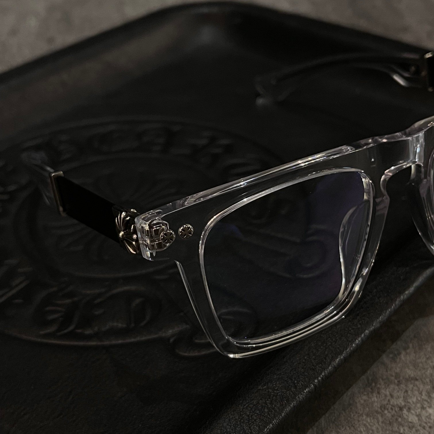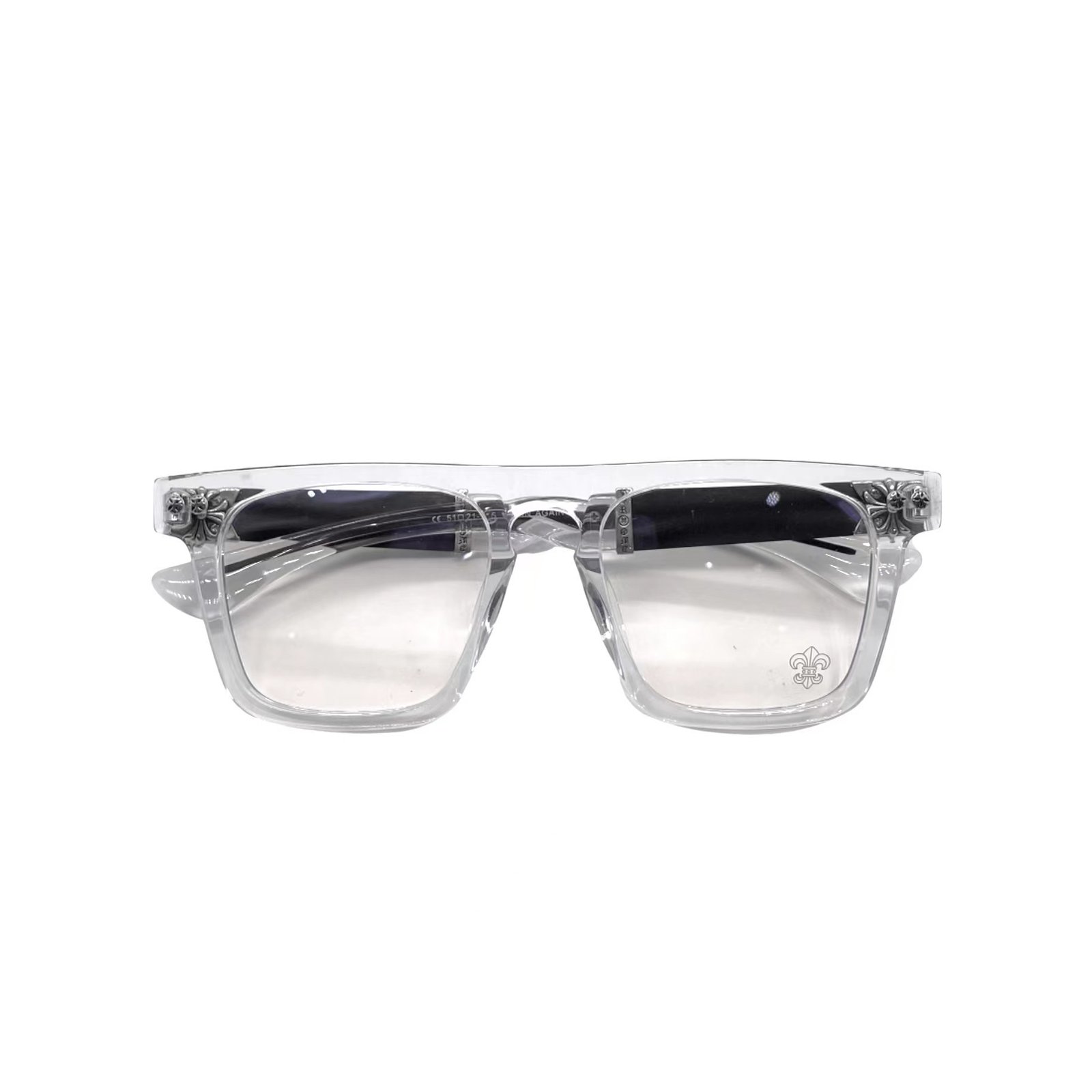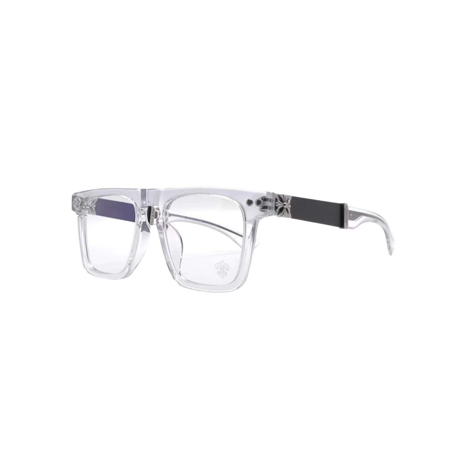 クロムハーツ RODSICLE 透明フレームメガネ透明なフロントフレームと真っ黒なテンプルが個性を表現するだけでなく、スタイリッシュな印象を与えます。ストリートカルチャーと融合したデザイン要素をテンプルの外側に施した独自のクロスフラワーレリーフ装飾により、様々な服装に合わせやすく、個性を際立たせます。