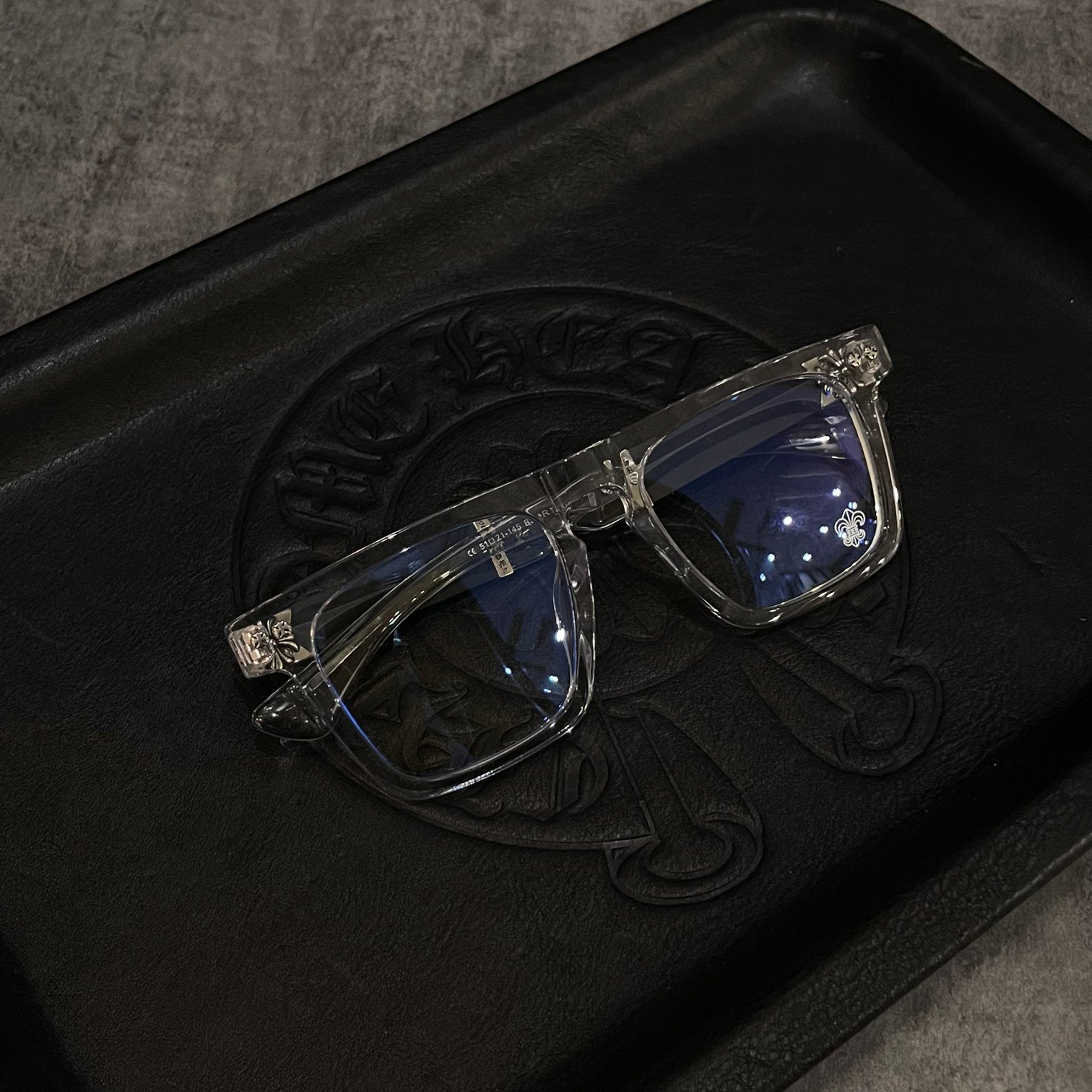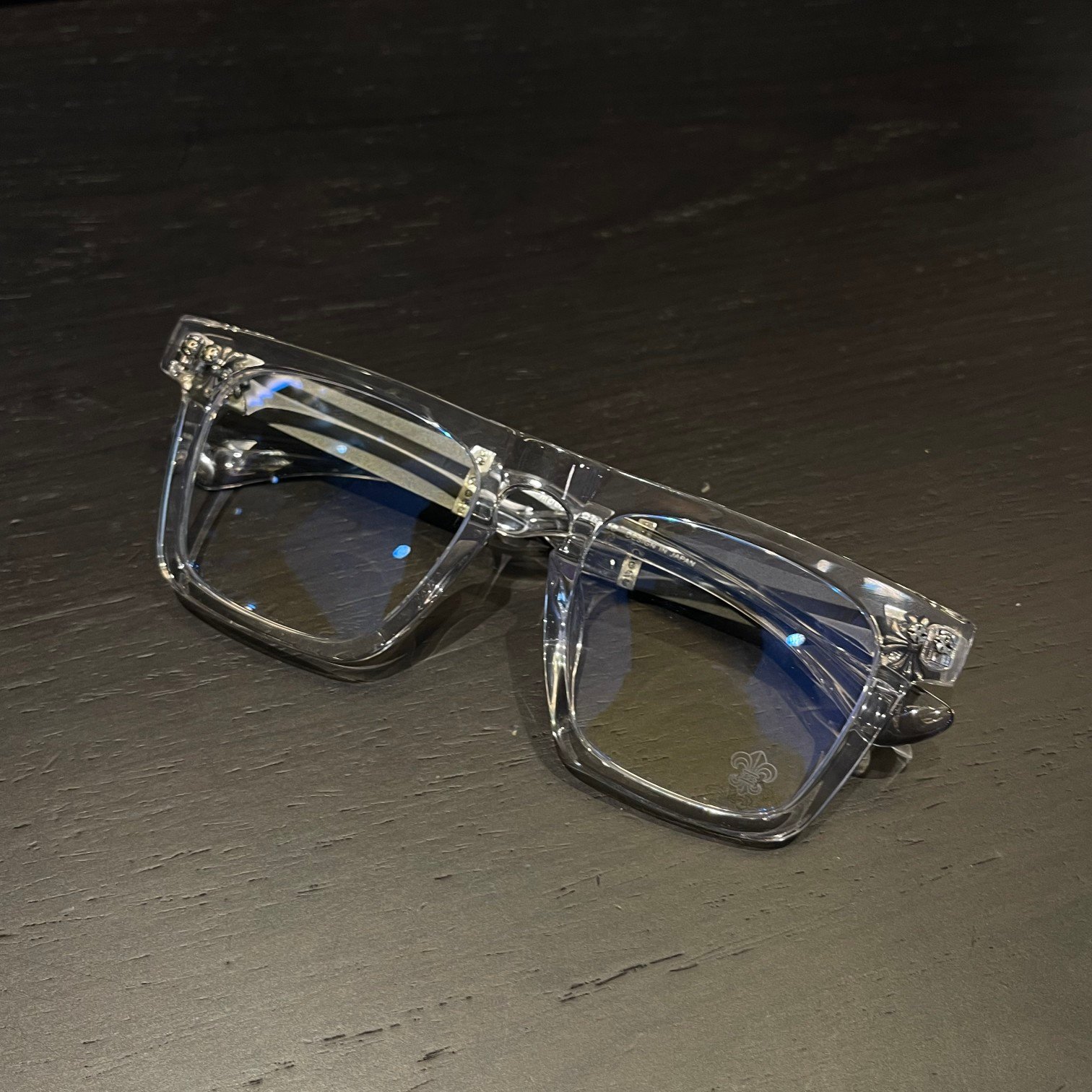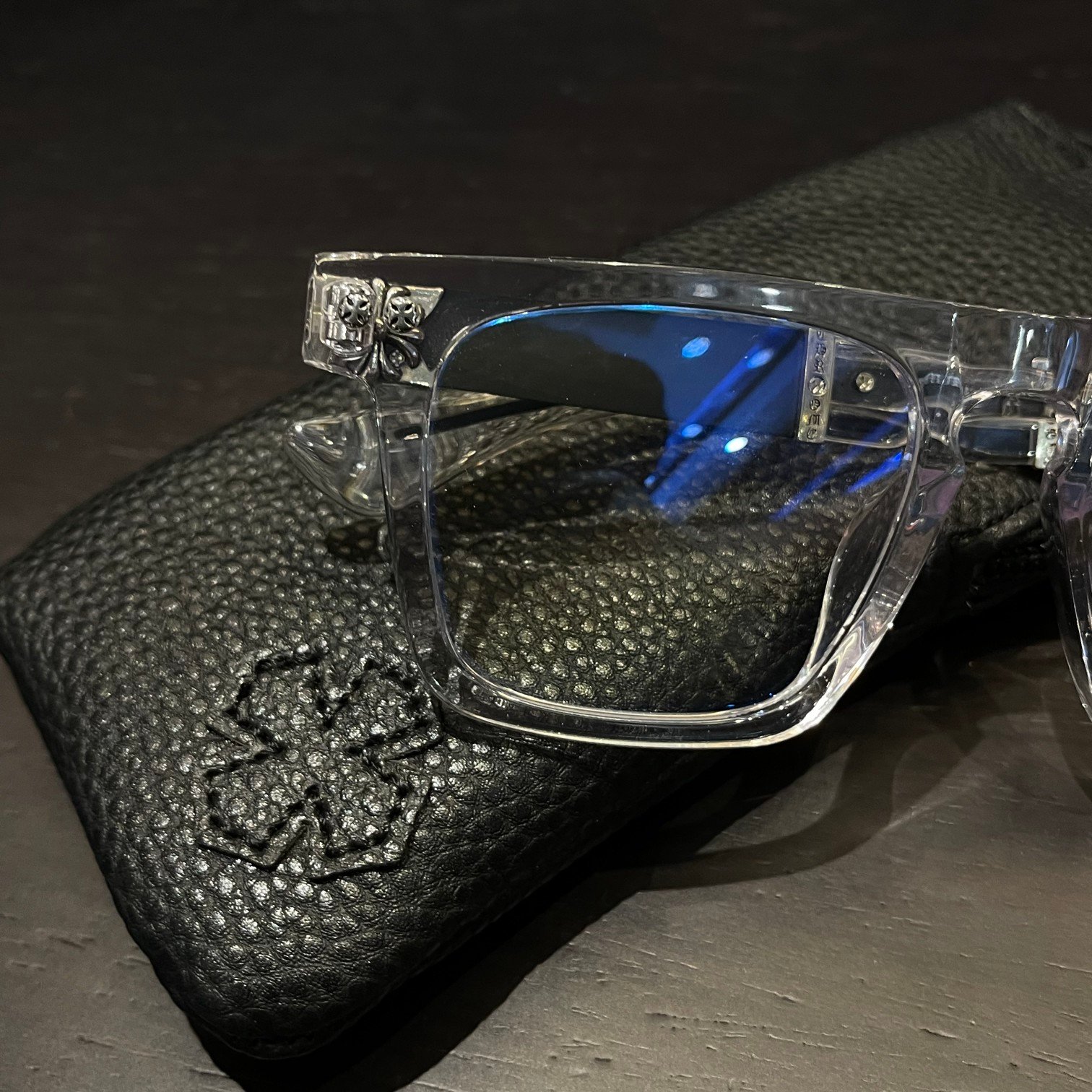 クロムハーツ RODSICLE 透明フレームメガネ透明なフロントフレームと真っ黒なテンプルが個性を表現するだけでなく、スタイリッシュな印象を与えます。ストリートカルチャーと融合したデザイン要素をテンプルの外側に施した独自のクロスフラワーレリーフ装飾により、様々な服装に合わせやすく、個性を際立たせます。