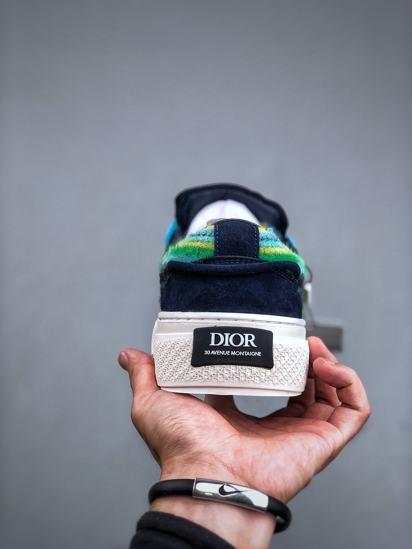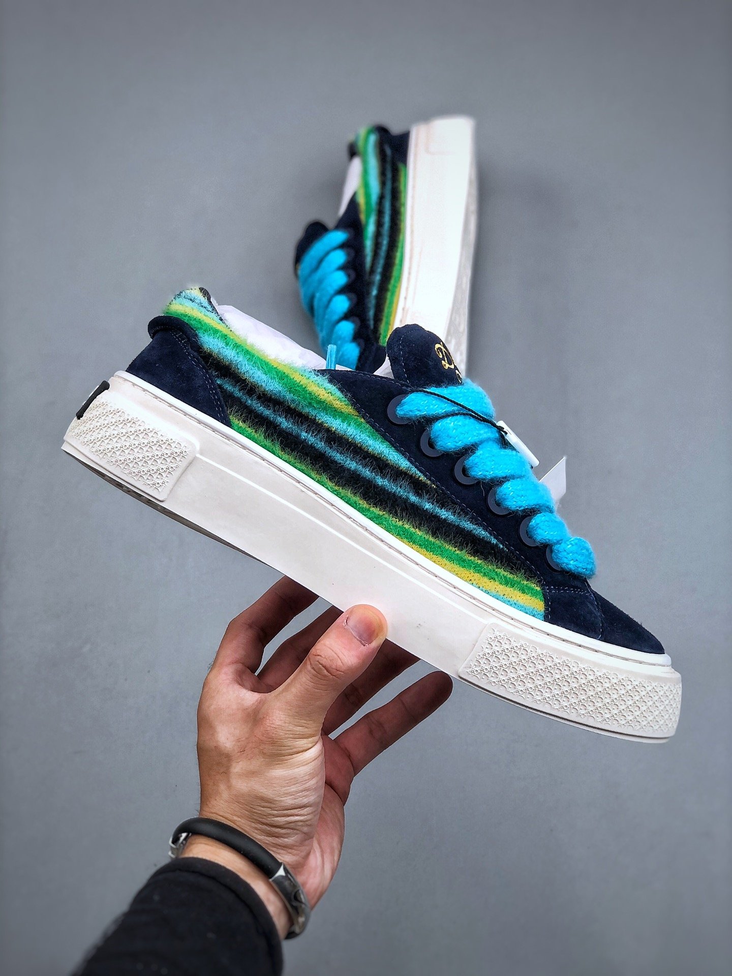 メゾンの比類なきサヴォワールフェールを体現した一足です。ネイビーブルー スエードのインサーション、Dior Tearsシグネチャーの刺繍が映えるパッド入りシュータン、ターコイズ モヘヤの幅広のシューレース、マット ネイビーブルー仕上げの真鍮製アイレットでアクセントをプラス。「ディオール オブリーク」モチーフが際立つクリームカラーのラバーソールのかかとには、Dior 30 Avenue Montaigneシグネチャーをあしらっています。さまざまなカジュアルルックにトレンド感を添えるスニーカーです。