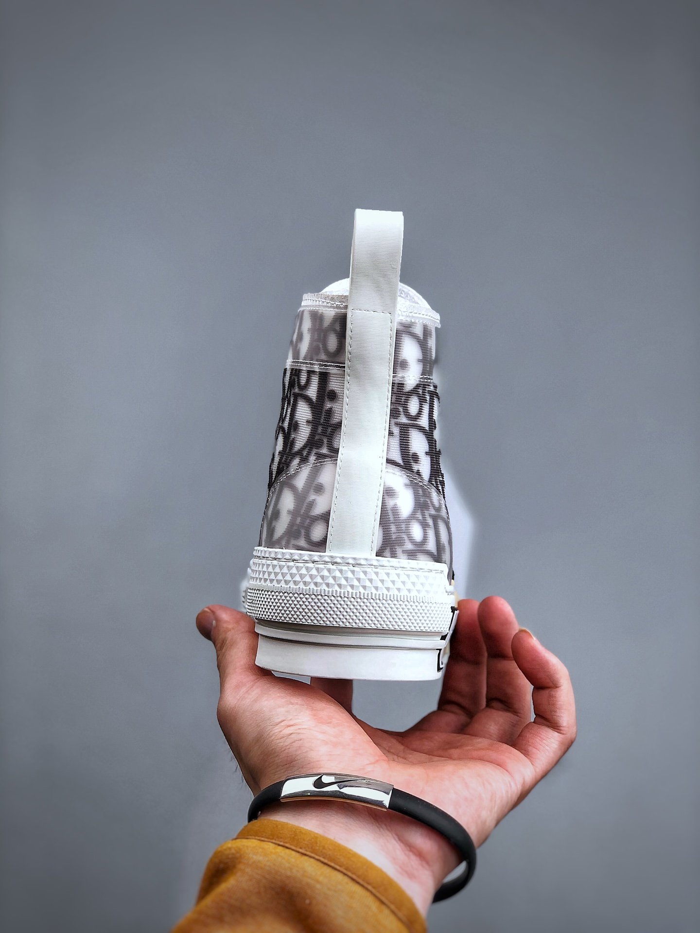 デザイナーのキム・ジョーンズによる初のディオール オム スニーカー コレクションには、2018 年 12 月のパリ ファッション ウィークでデビューしたディオール B23 ハイ「ディオール オブリーク」シューズが含まれています。クラシックなハイトップ トレーナーを現代的に解釈したこのシューズは、テクニカル キャンバスのアッパーにクラシックなディオール オブリーク パターンがプリントされています。透け感のあるメッシュのオーバーレイがクチュール風のタッチを加え、カーフスキンのプルタブが高級感を演出しています。足元には、ディオール ブランドのバンパー ロゴがあしらわれた 2 トーンのラバー アウトソールがデザインを引き立てています。