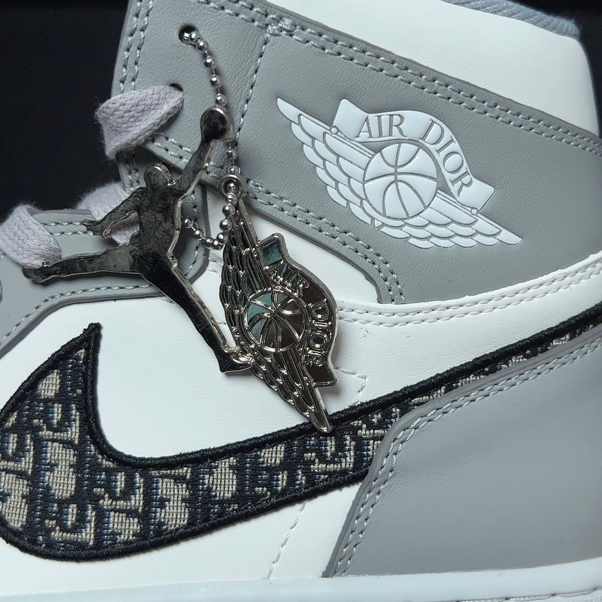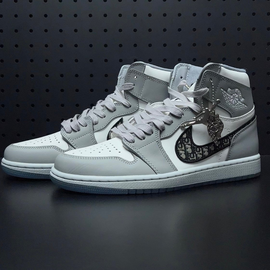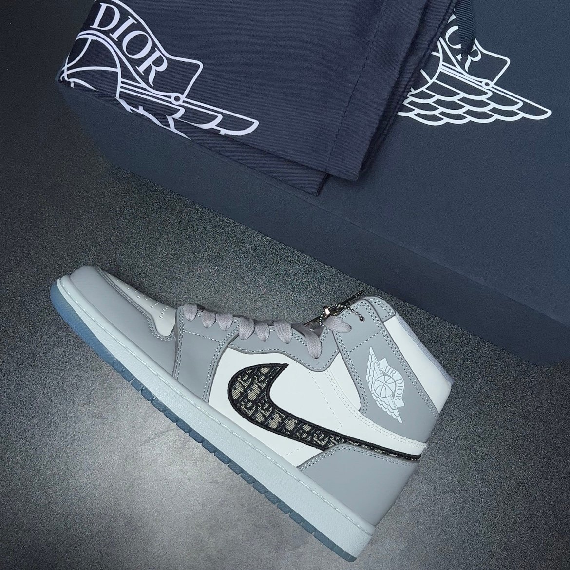 NIKE(ナイキ)の名を飛躍させたAIR JORDAN 1(エアジョーダン1)をベースに採用し、ホワイトとライトグレーのシンプルなカラーで構築。 サイドのスウッシュには、DIOR(ディオール)の象徴である”DIOR OBLIQUE(ディオールオブリーク)”を使い、シュータンのNIKE AIRロゴには”DIOR”の文字刻んだ。透明感が美しいライトブルーのクリアソールの内側にも、巨大な”ウィングロゴ”と”DIOR”のロゴを配置しコラボレーションの証として大きな存在感を演出している。