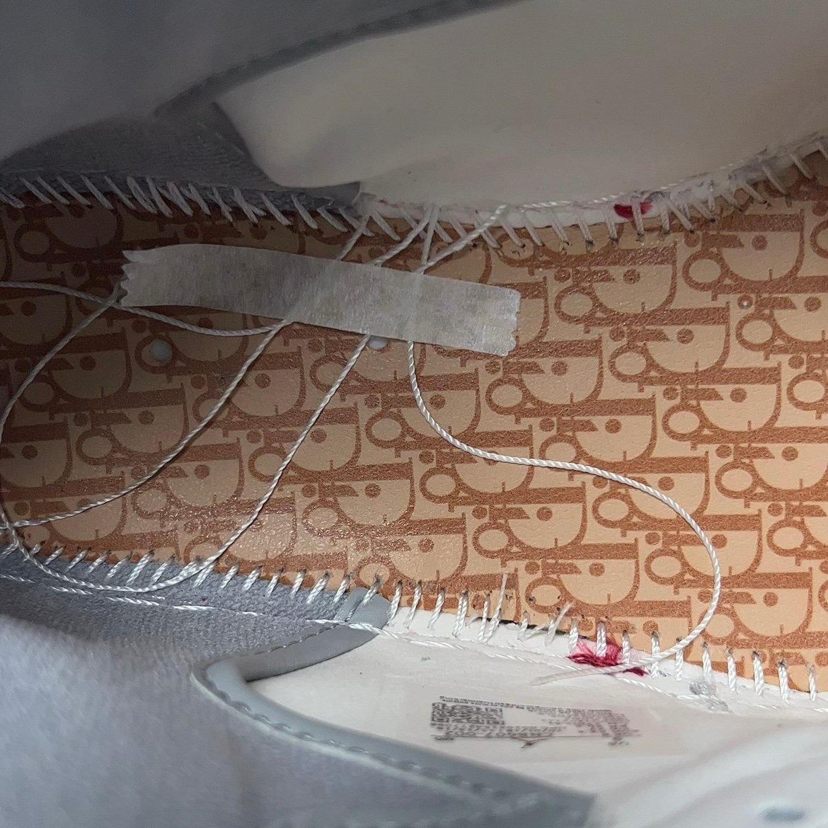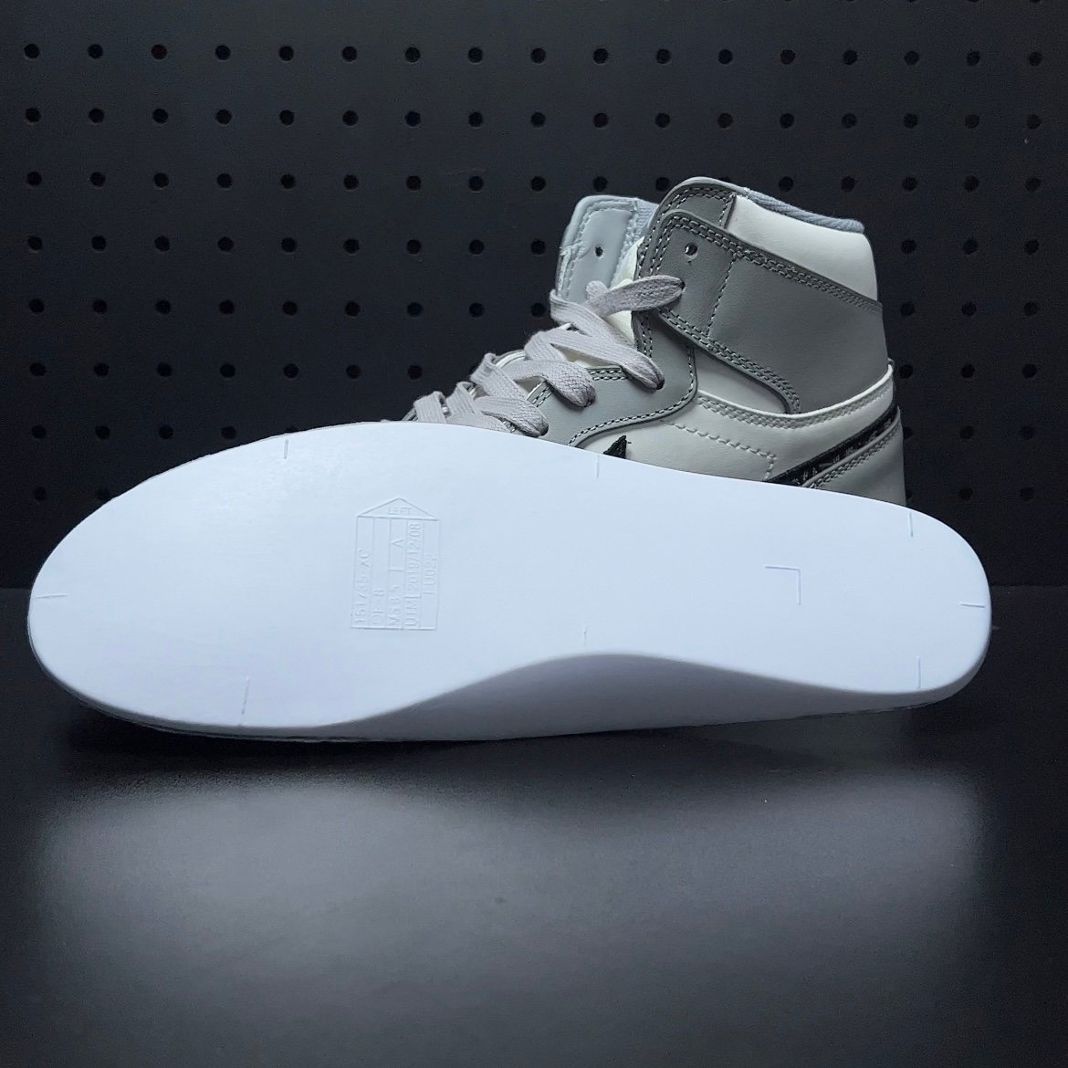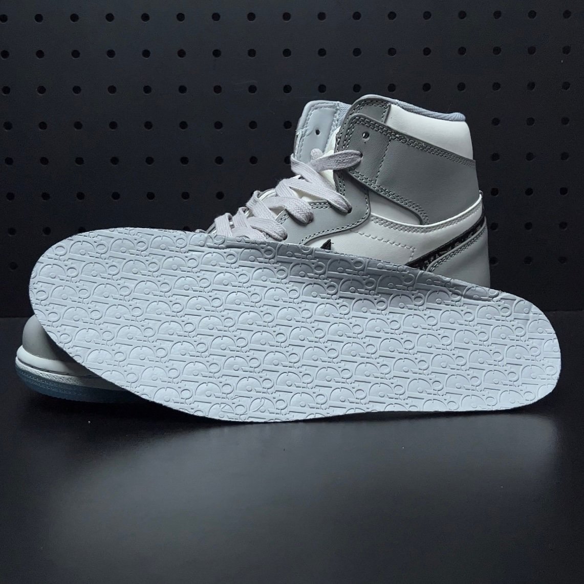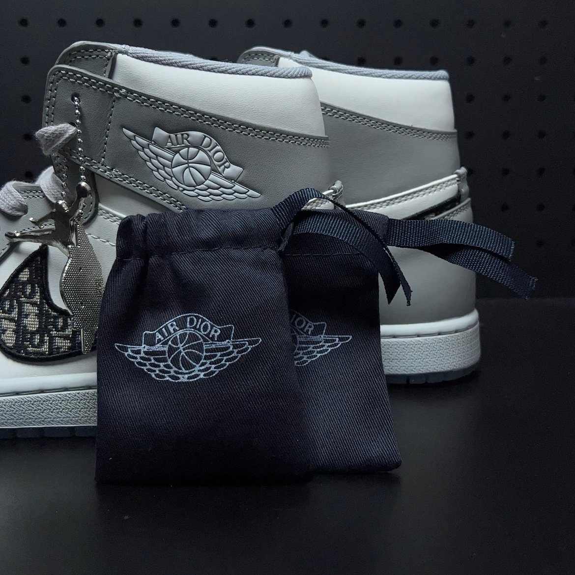 NIKE(ナイキ)の名を飛躍させたAIR JORDAN 1(エアジョーダン1)をベースに採用し、ホワイトとライトグレーのシンプルなカラーで構築。 サイドのスウッシュには、DIOR(ディオール)の象徴である”DIOR OBLIQUE(ディオールオブリーク)”を使い、シュータンのNIKE AIRロゴには”DIOR”の文字刻んだ。透明感が美しいライトブルーのクリアソールの内側にも、巨大な”ウィングロゴ”と”DIOR”のロゴを配置しコラボレーションの証として大きな存在感を演出している。
