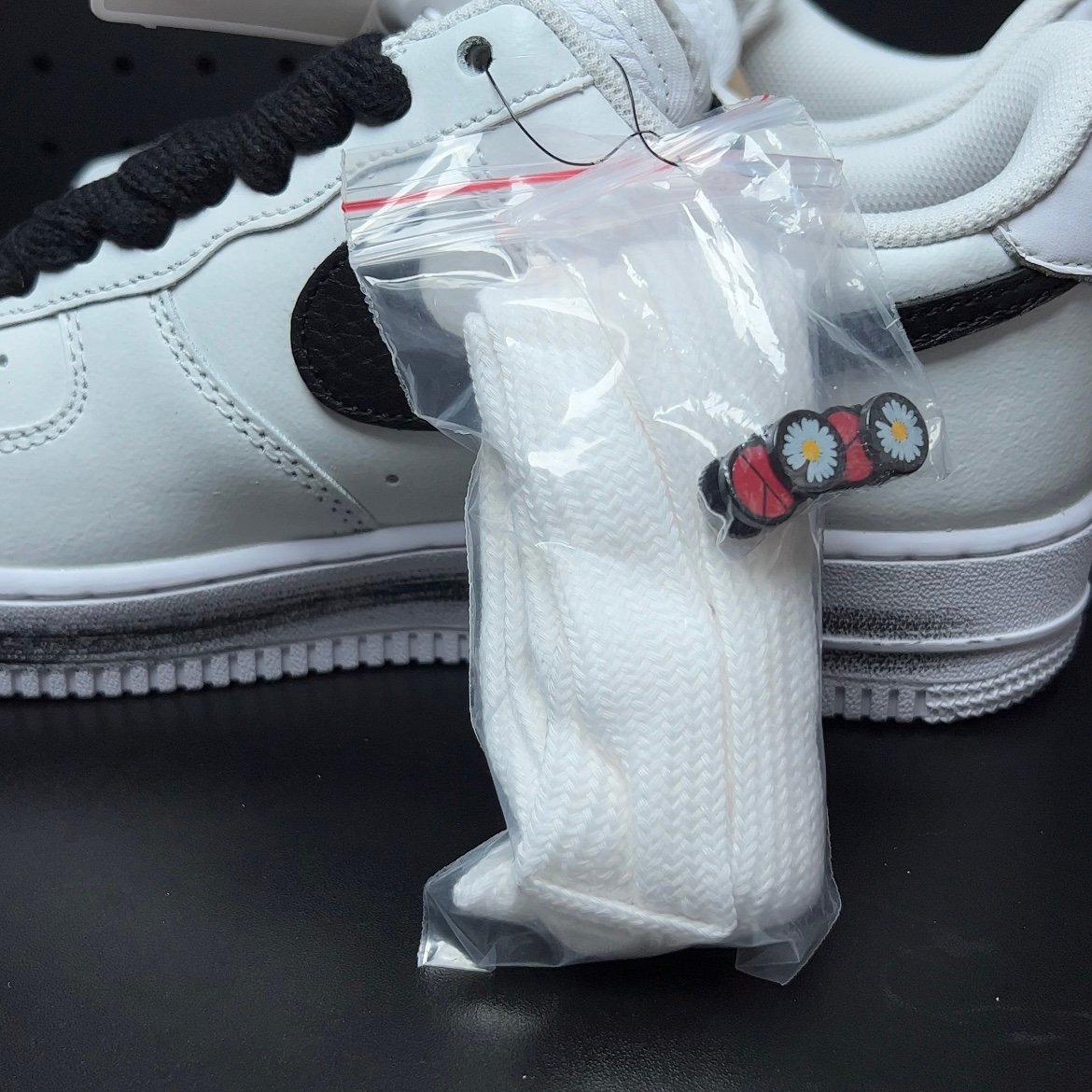 通常に比べボリュームある極太シューレースや、”デイジー”がプリントされたシューホールに取り付け可能なピン、ミッドソールに描かれた霞んだラインなど、様々な角度から新しい解釈を生み出し独創的な意味を込めるG-DRAGON(ジードラゴン)らしい一足に仕上がっていた。