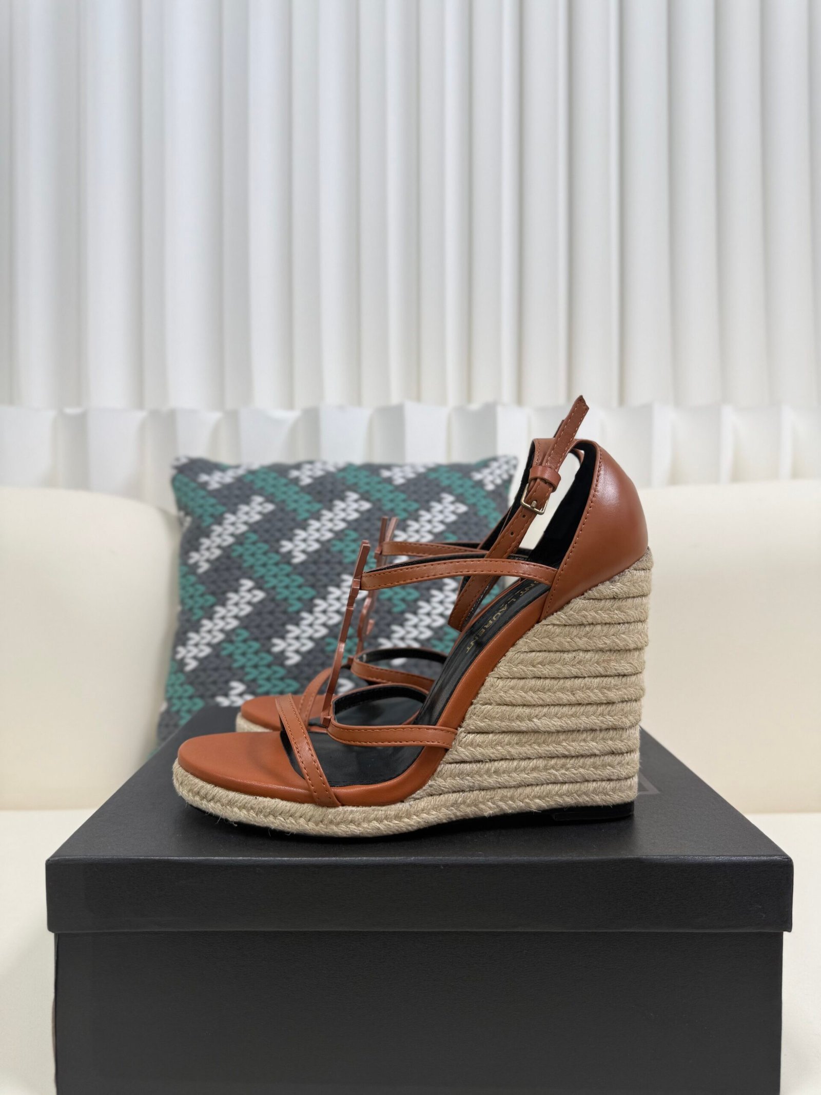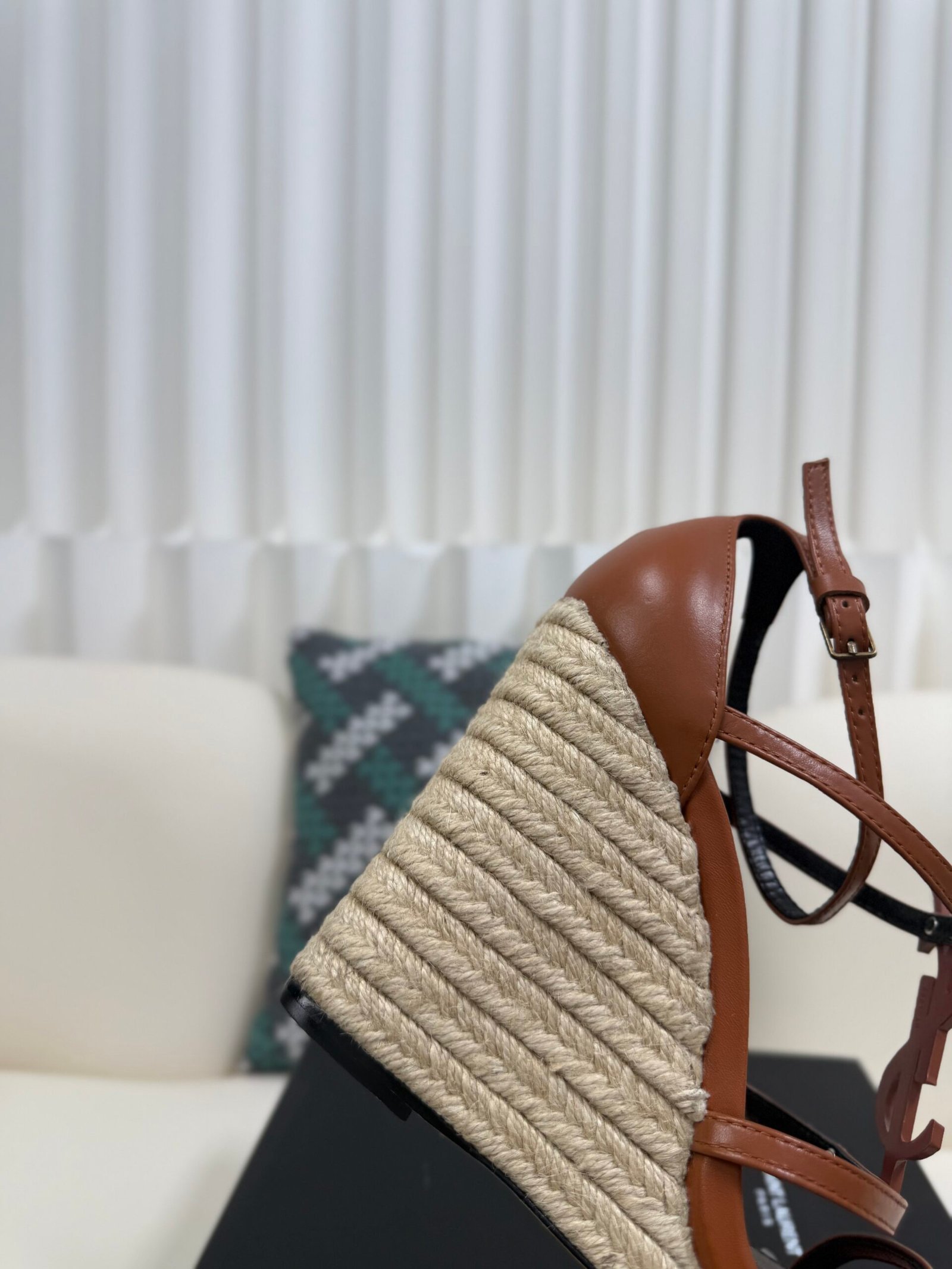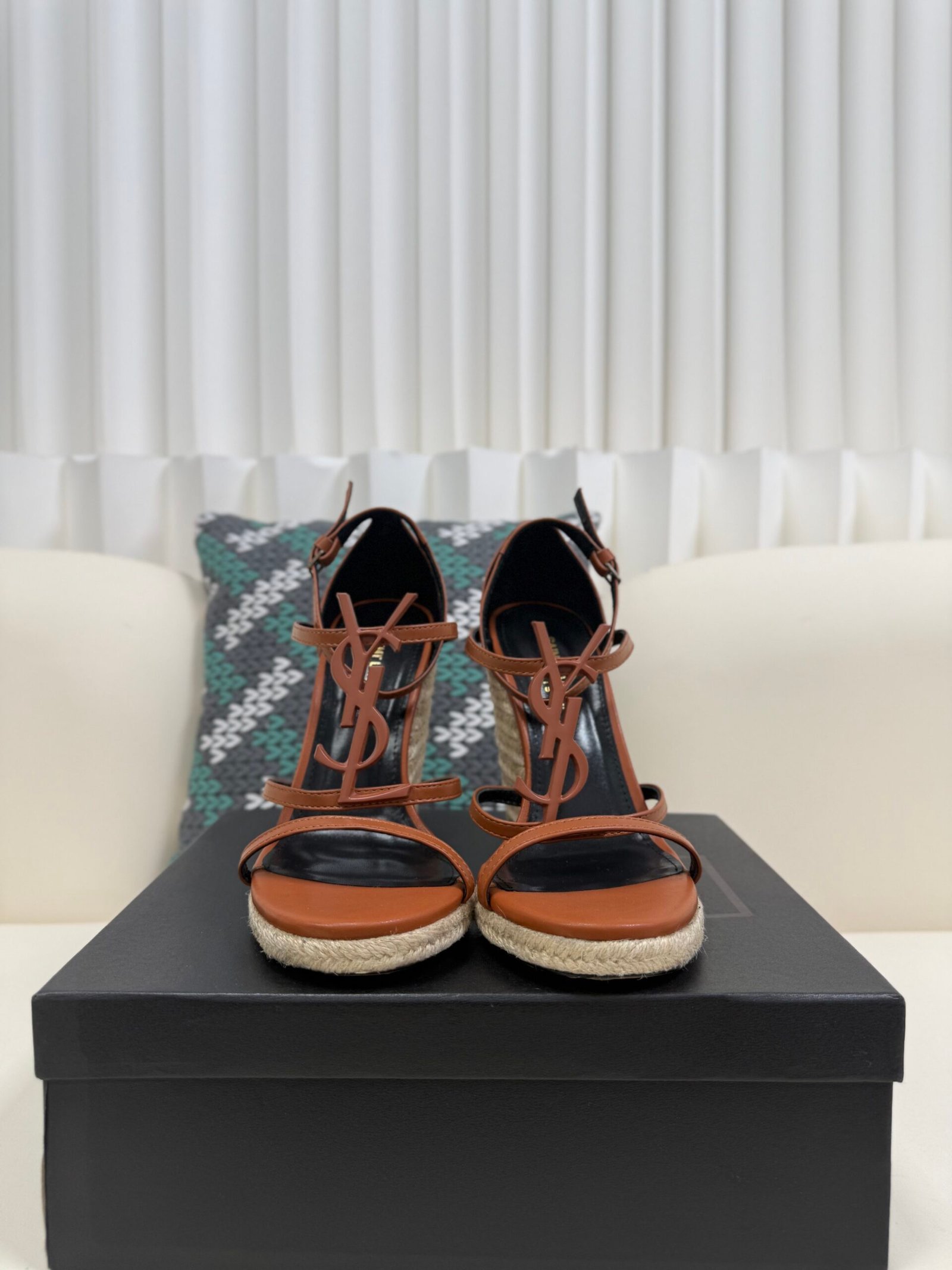 YSL Saint Laurent Logo High-Heeled Wedge Straw Leather Sandals / Heel Height 10.5CM