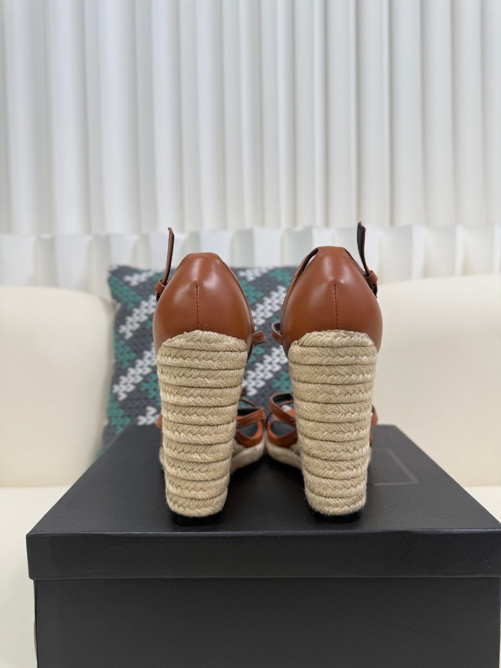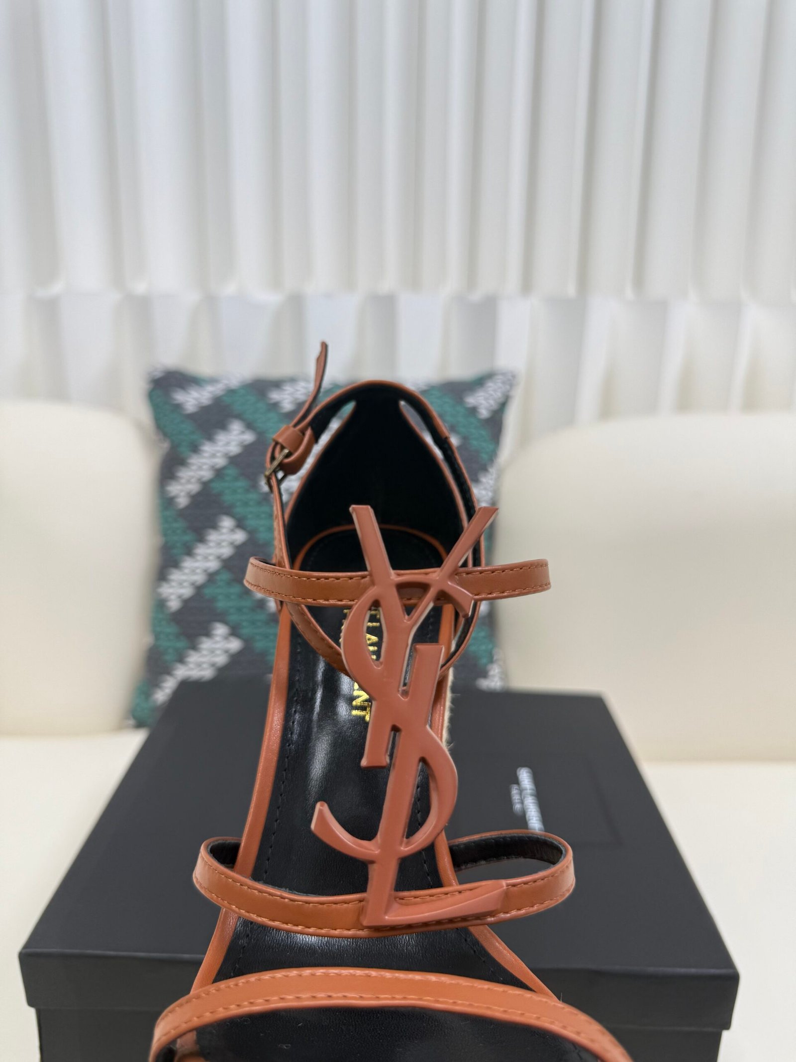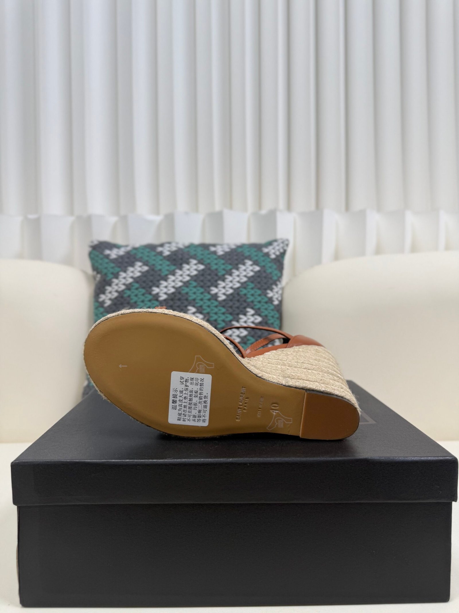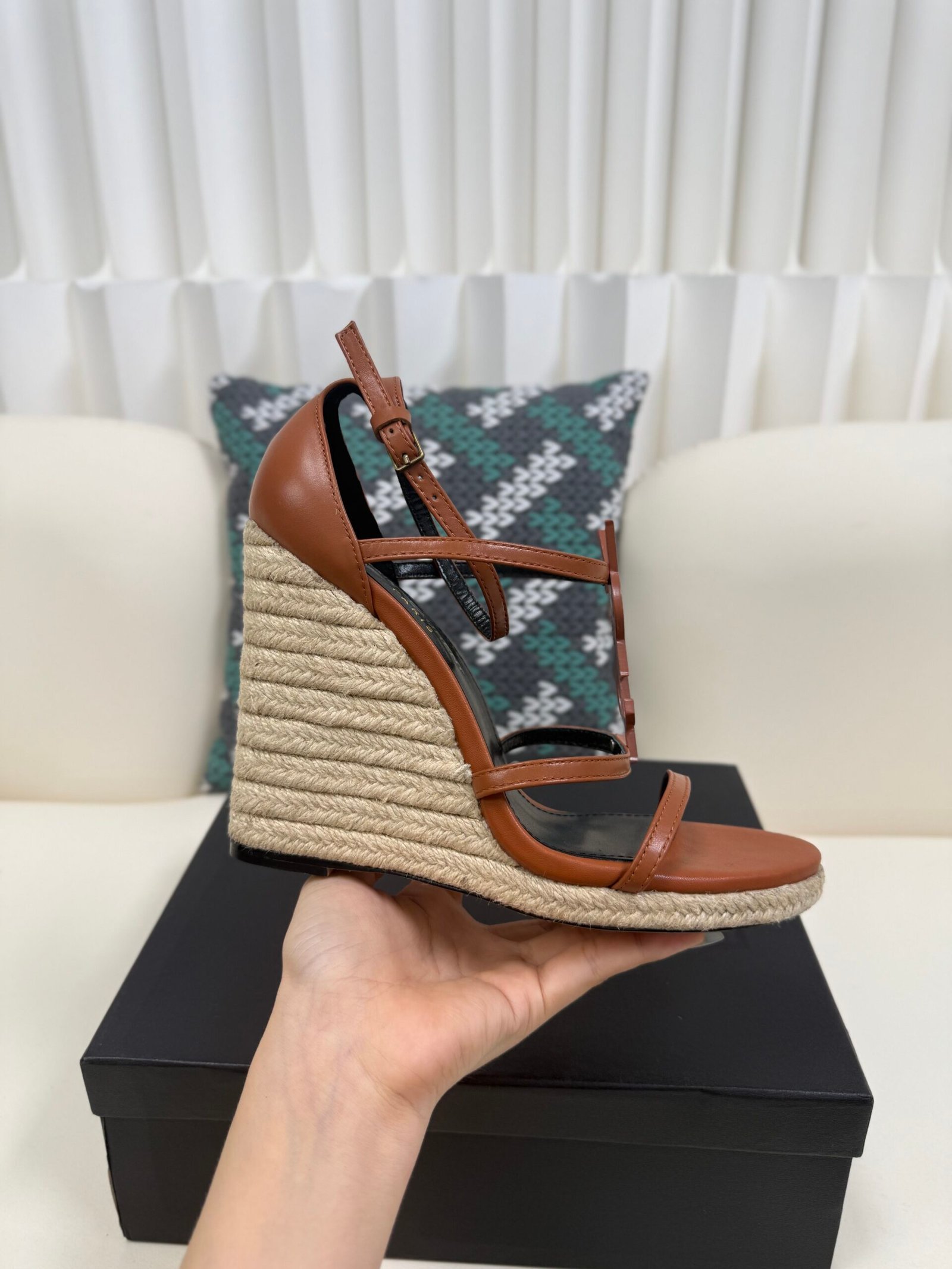 YSL Saint Laurent Logo High-Heeled Wedge Straw Leather Sandals / Heel Height 10.5CM