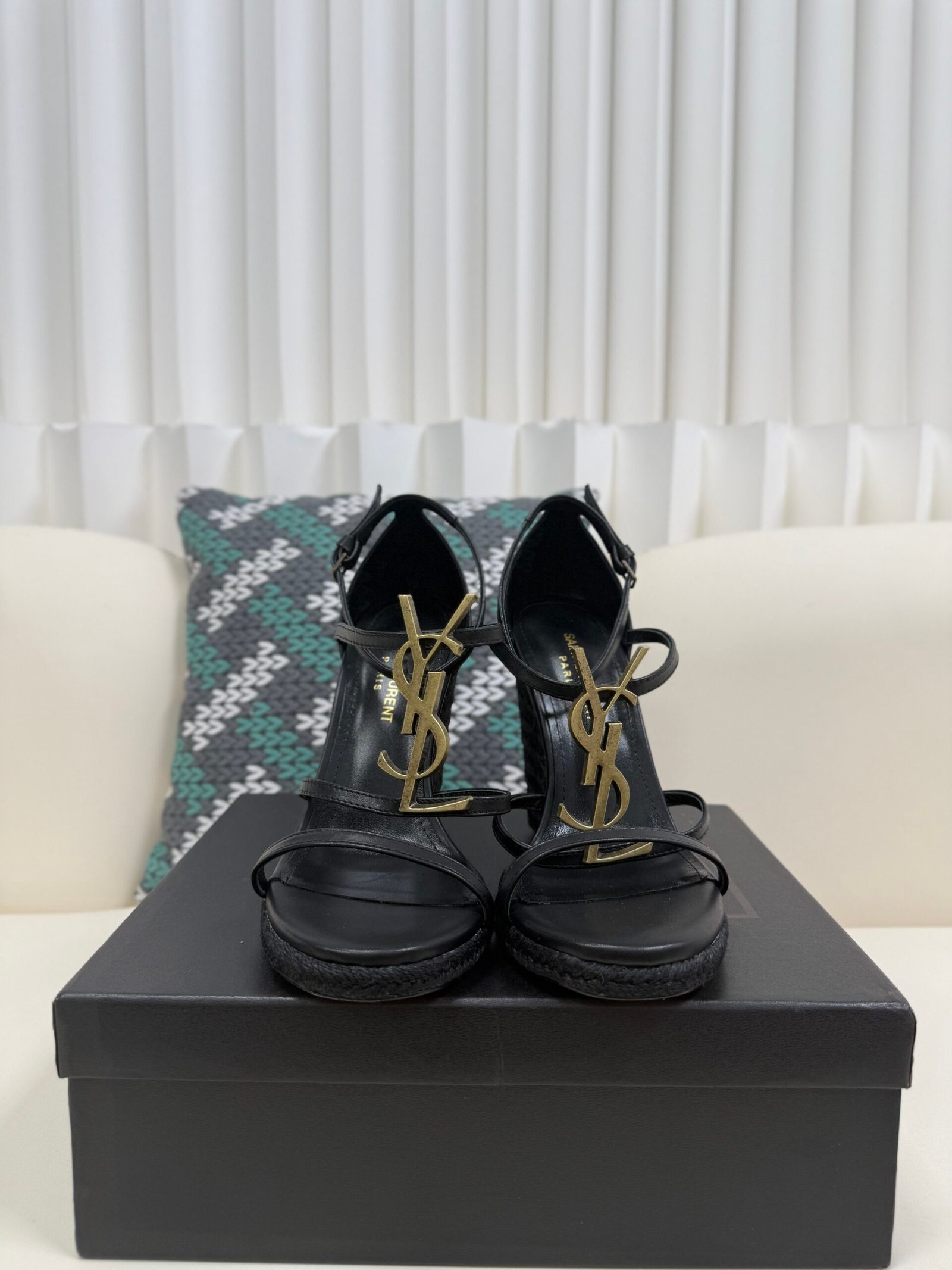 YSL Saint Laurent Logo High-Heeled Wedge Straw Leather Sandals / Heel Height 10.5CM